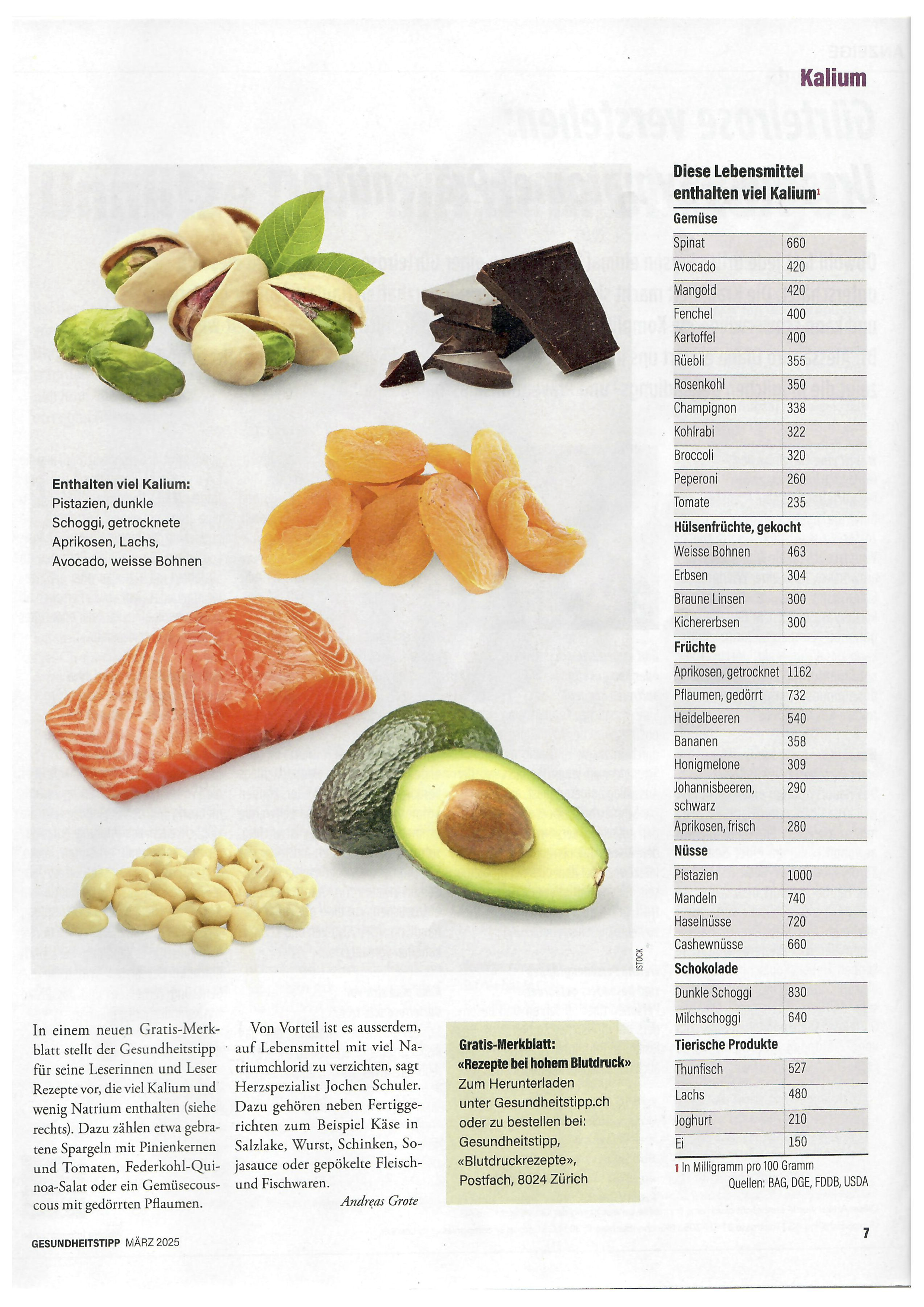 Lebensmittel / Bluthochdruck Von René Moser | 17. April 2025 0 Kommentare Quelle: Gesundheitstipp.ch Bluthochdruck__Das_hilft_Herunterladen Blutdruck__Rezepte_mit_viel_KaliumHerunterladen